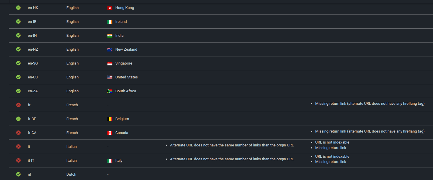 All pages in your hreflang set should include the same number of hreflang tags. A mismatch – e.g. 25 tags on one page and 24 on another -usually means a missing return link or an inconsistent tag.
